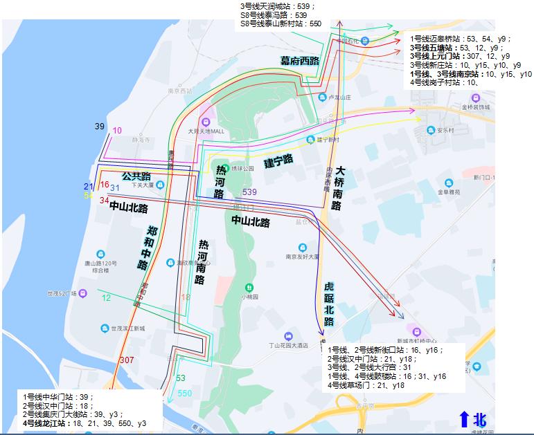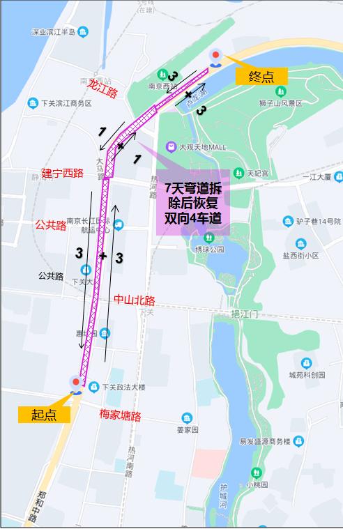 车辆北向南可由正三街、中山北路驶回郑和中路,或由龙江路、江边路绕行。