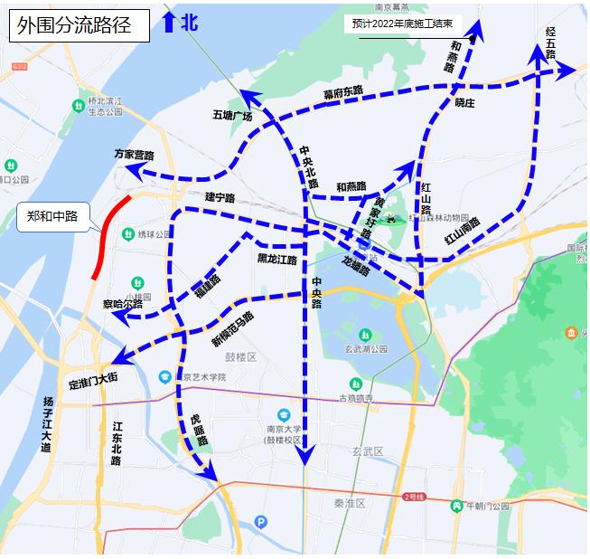 郑和中路施工期间,社会车辆可由纬一路、经五路、和燕路、红山南路、中央北路、中央路、新模范马路、建宁路、虎踞路外围分流绕行。