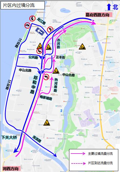 片区内居民绕行建议-南向北东侧可由梅家塘路、热河南路、姜家园路通行,西侧可由九家圩路、唐山路、哈尔滨路、江边路通行;