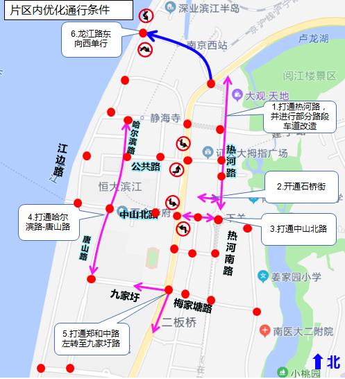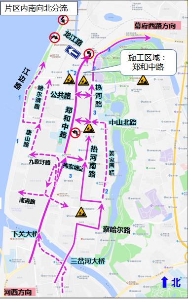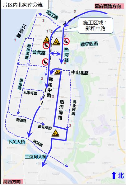 片区内居民绕行建议-北向南东侧由热河路、热河南路、姜家园路通行,西侧龙江路东向西单向通行,可由江边路、哈尔滨路、唐山路、九家圩路、淮滨路通行。