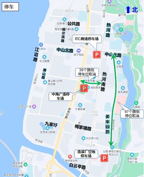 在尽力保留姜家园路(姜圩路-中山北路)等部分单侧泊位的同时,中海广场、白云亭文化艺术中心等5个公共停车场、2462个泊位已协调供居民有偿使用。为保障施工期间片区出行安全及出行质量,取消梅家塘路及姜家园路部分停车位共135个: