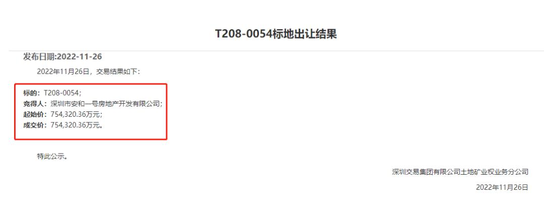 11月28日公告显示,只有深圳市安和一号一家公司在上午10时12分报价,并没有其他竞买人,深圳市安和一号以底价75.43亿元报价成交。
