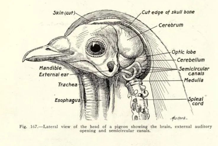 鸟类的头部构造|lohdownonscience.com麦克走路还能保持平衡,可能是因为同样位置靠后、负责平衡感受的小脑(cerebellum)也幸免于难,也可能是得益于鸟类的两套相互独立的运动感知系统——位于头部内耳处的前庭系统(vestibular system)负责飞行平衡,而行走平衡则由位于腰骶部的特化神经系统控制。