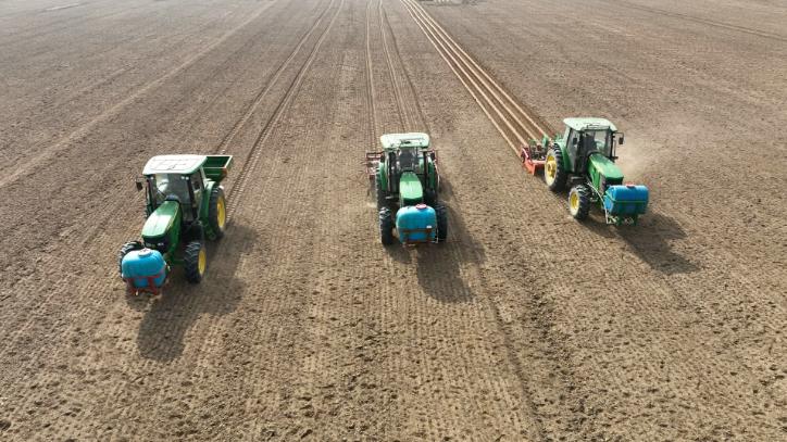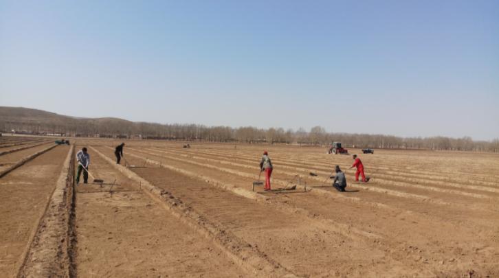 走进兴和县大同夭乡丰润泽农民专业合作社种植基地,翻耕机隆隆作响,来回穿梭作业,进行土地平整,工人们正在收集地里的地膜,一片忙碌的春耕场景。