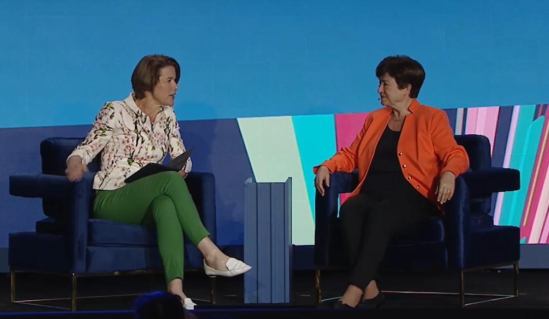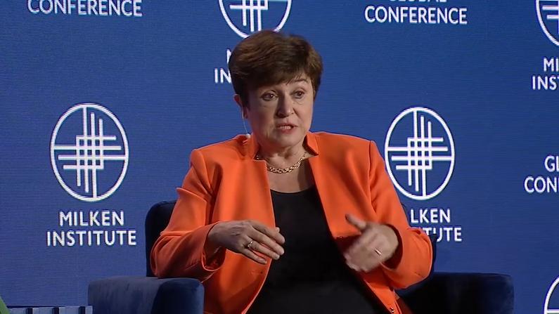 IMF总裁格奥尔基耶娃5月1日发表讲话,视频截图根据米尔肯研究所网站发布视频,对谈中,主持人、彭博社经济与政府部门主管兼彭博经济研究主管弗兰德斯(Stephanie Flanders)就“去美元化”趋势向格奥尔基耶娃提问。