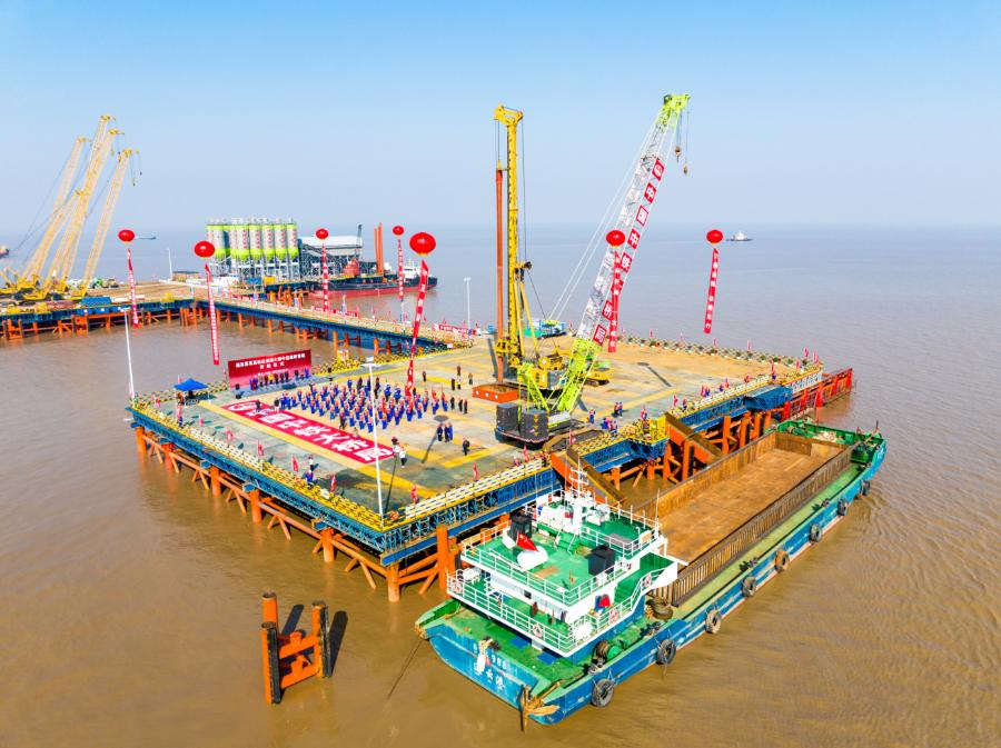 “为确保中航道超长钻孔桩顺利施工,项目部紧盯现场管理,按照标准化作业要求精细组织施工,采用国产超大扭矩旋转钻组合接力创新技术钻进成孔工艺,确保首桩开钻任务顺利完成。”中铁大桥局新建南通至宁波高速铁路站前Ⅲ标项目经理蒋本俊说。