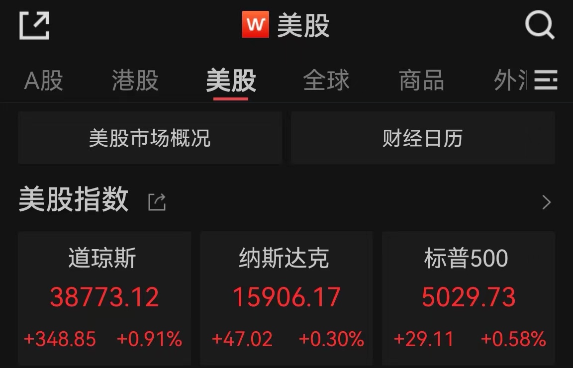 北京时间16日凌晨,美国三大股指集体收涨。截至收盘,道指涨0.91%报38773.12点,纳指涨0.30%报15906.17点,标普500指数涨0.58%报5029.73点。标普500指数收盘再创历史新高。科技股多数下跌,银行股表现强劲,能源股集体上涨,抗疫概念股全线上涨。