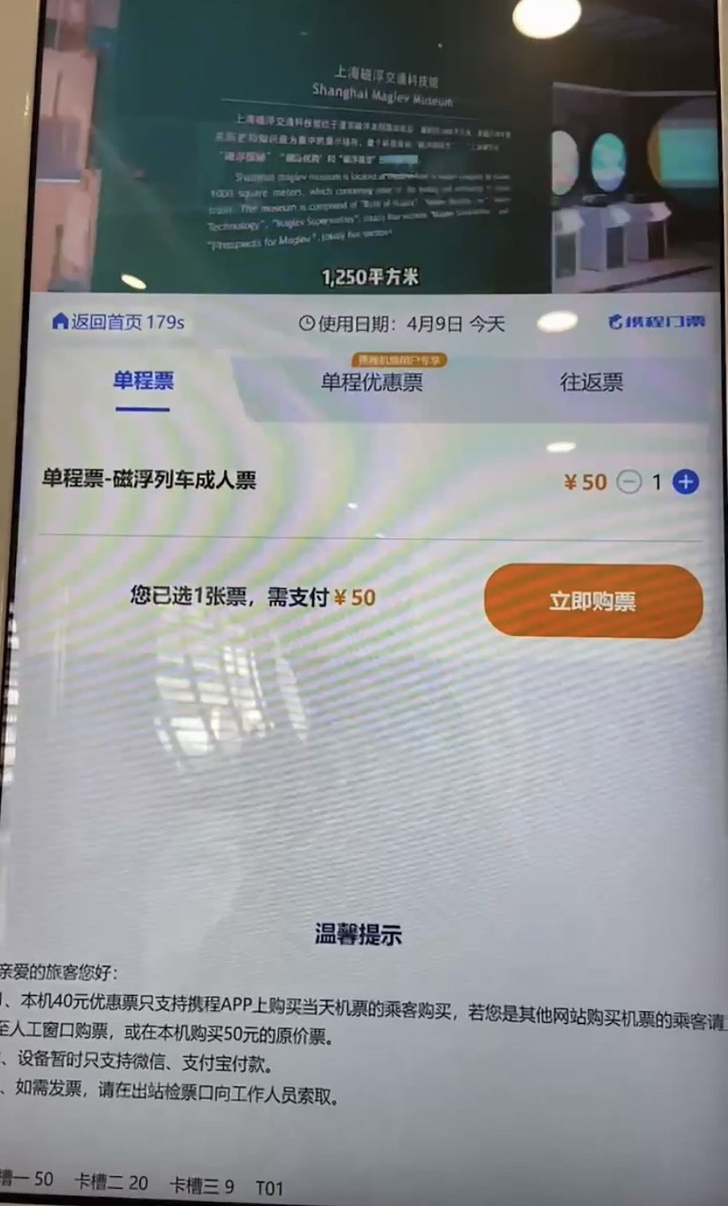 搭乘磁浮列车,从龙阳路到浦东国际机场仅需8分钟,乘客只能在这两站上下车。换言之,绝大多数在龙阳路站购买磁浮列车票的乘客都要前往浦东机场乘机,且持有当日机票。但由于没有显著的优惠告示,一些旅客在使用自助机器购票时,就直接扫码付款了50元。此外,机器本身仅支持携程用户优惠购票,对于大部分乘客来说也并不方便。