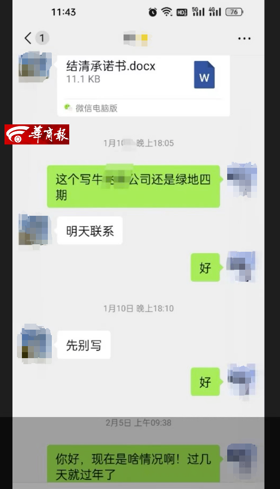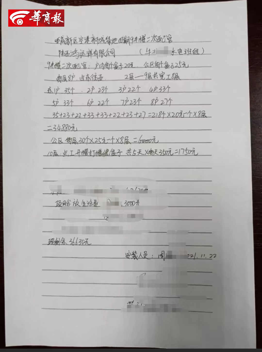 周师傅是商洛人,2021年10月中旬到11月底,他和妹夫、弟弟三人在空港绿地新城四期项目上做水电安装。“找我们做活的是陕西鸿运祥有限公司,负责人姓牛,是专门的水电班组。”周师傅告诉华商报大风新闻记者,项目有总包分包,他们是给小包工头干活的,当时只给发了3000元生活费,干完活让他们先回家,说是其余钱年底给。年底他们来要钱时说上面没给,3人各被欠1万多元,合计约5万元。当时一起被欠薪的还有其他十来个人。