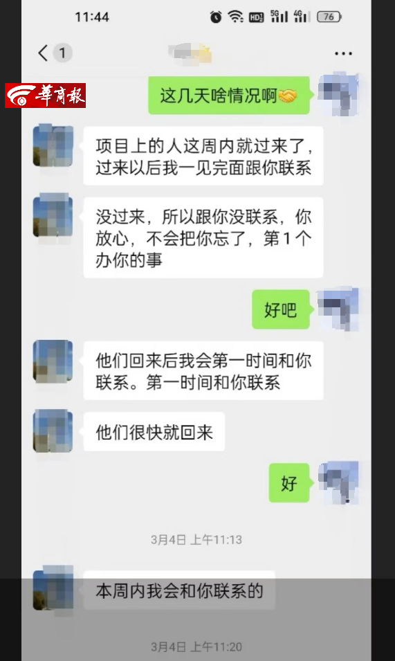 从上述对话记录看出,空港新城劳动监察大队的这位工作人员也在积极处理,就是始终没有结果。“除了微信沟通我还给他打了无数次电话,还到空港新城找过他,但至今没拿到一分钱。”周师傅很无奈。25日上午,华商报大风新闻记者致电这位工作人员,他听到记者反映周师傅讨薪问题,立即回应他是绿地四期项目的。“我24日和他还联系过,准备下周见面。”随即表示家中有急事不方便,下周再和记者沟通。