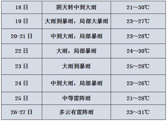 降水和强对流:预计19日我市入梅,将进入降水集中期。25日前我市多强降水过程,其中18日夜里至19日我市有大雨到暴雨,局部大暴雨。20-22日主雨带略有北抬,我市中到大雨,部分地区暴雨。受冷空气影响,23-24日主雨带南落,我市部分地区大雨到暴雨,局部大暴雨。25日白天至27日主雨带再次北抬,我市以雷阵雨天气为主,部分地区雨量中等。未来十天全市累计降水量:250~300毫米,局部地区300~400毫米,过程将伴有短时强降水(最大小时雨强40~60毫米,局部达70毫米以上)、8~10级雷暴大风等强对流天气。