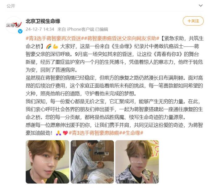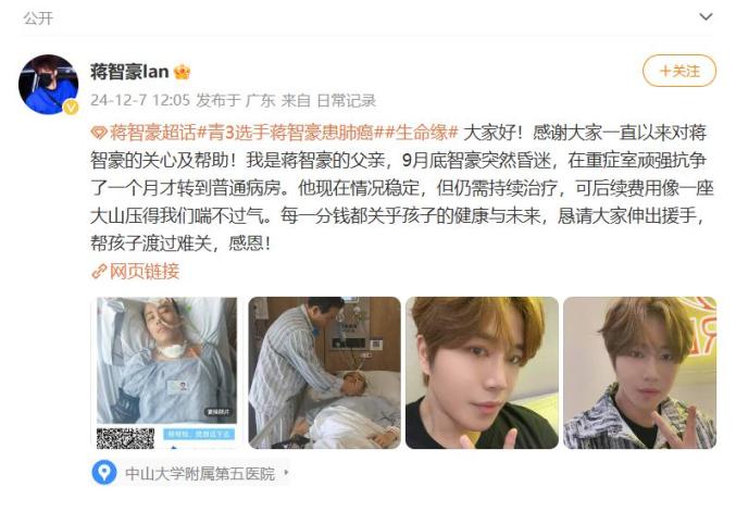 近日,28岁男艺人蒋智豪父亲在其社交账号发声,称其9月底突然昏迷,在ICU顽强抗争一个月才转到普通病房,现在情况稳定,但仍需持续治疗。