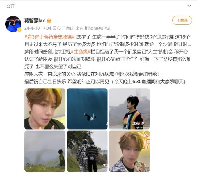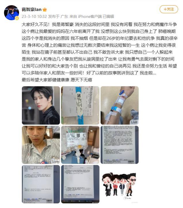 命运弄人,2023年3月10日,蒋智豪在社交平台上发布与世界告别的消息,透露自己身患肺癌晚期。最爱的母亲六年前因肺癌离开了人间。蒋智豪表示没想到那么快就到他的身上,明明不抽烟,却在26岁的年纪遭遇身体和心理的痛苦,真的很辛苦。