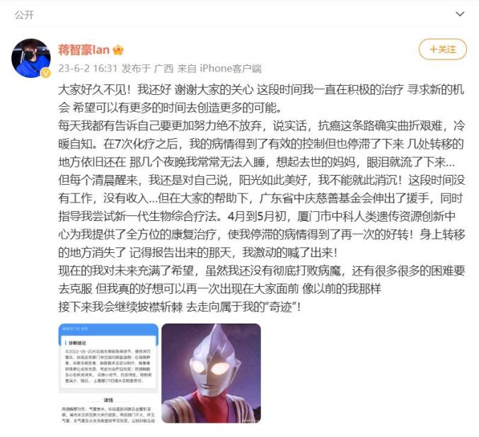 2023年6月,蒋智豪发文称一直在积极的治疗,寻求新的机会,希望可以有更多的时间去创造更多的可能。