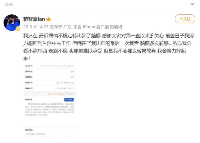 2023年9月,蒋智豪发文称,自己的病情不稳定转移到了脑膜。