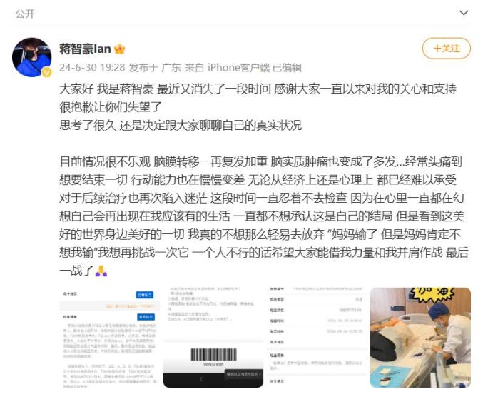 6月,蒋智豪发声称自己的情况很不乐观,脑膜转移复发加重,脑实质肿瘤也变成多发。