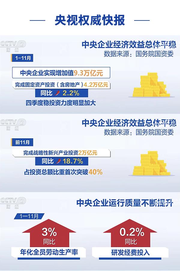 中央广播电视总台、中国证券报、证券日报等媒体报道高度关注2024年中央企业经济效益——数据显示,中央企业运行顶住压力、稳中有进,经济效益总体平稳。1月份至11月份实现增加值9.3万亿元,完成固定资产投资(含房地产)4.2万亿元、同比增长2.2%,年化全员劳动生产率、研发经费投入强度持续提升,资产负债率总体稳定,服务大局坚决有力,保障民生主动作为,有力发挥了国民经济稳定器、压舱石作用。