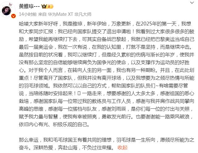 2025年1月1日,“雅思组合”黄雅琼发文称,已经向国家队提交了退出申请。