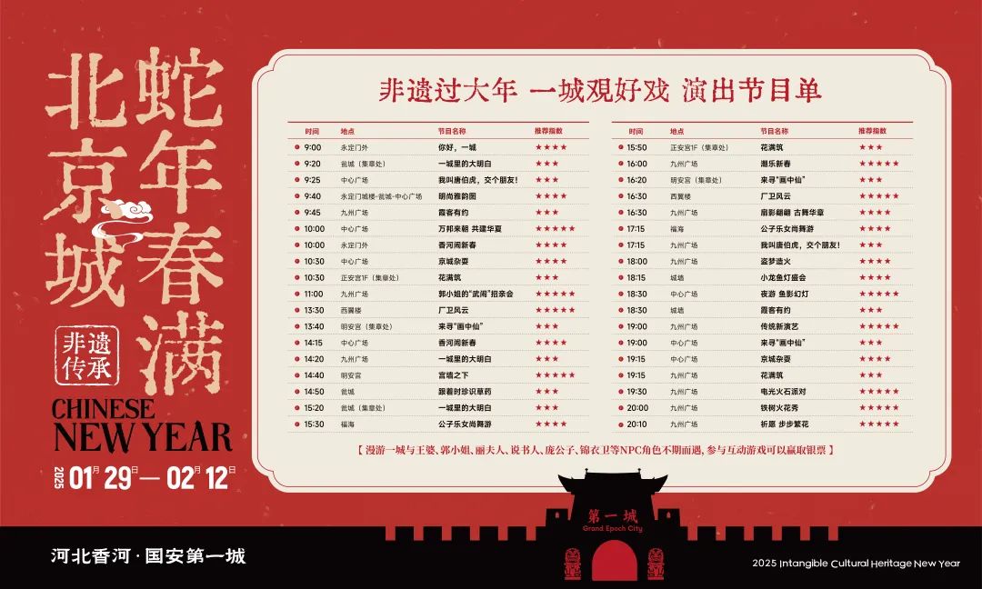 2025年1月29日-2月12日,在国安第一城,这座精心复原的明清古城,一场以 “春满北京城 非遗过大年” 为主题的蛇年春节庆典即将盛大启幕。