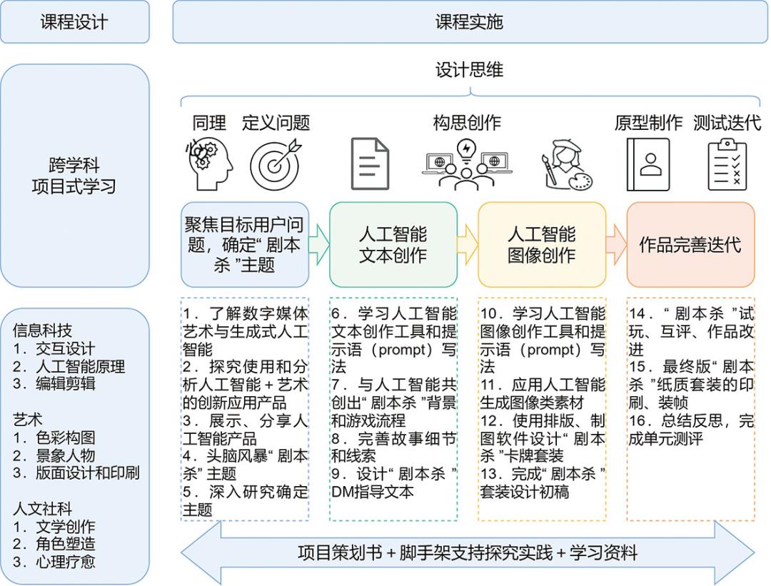 本课程通过聚焦目标用户问题确定剧本主题、人工智能文本创作、人工智能图像创作,以及作品完善与设计迭代4个主要环节,系统地引导学生从零开始,逐步构建出一个完整的“剧本杀”项目。学生在教师的引导下,不仅学会了如何运用生成式人工智能工具生成文本和图像内容,还通过团队合作,将这些内容融合成为一套完整的“剧本杀”套装。