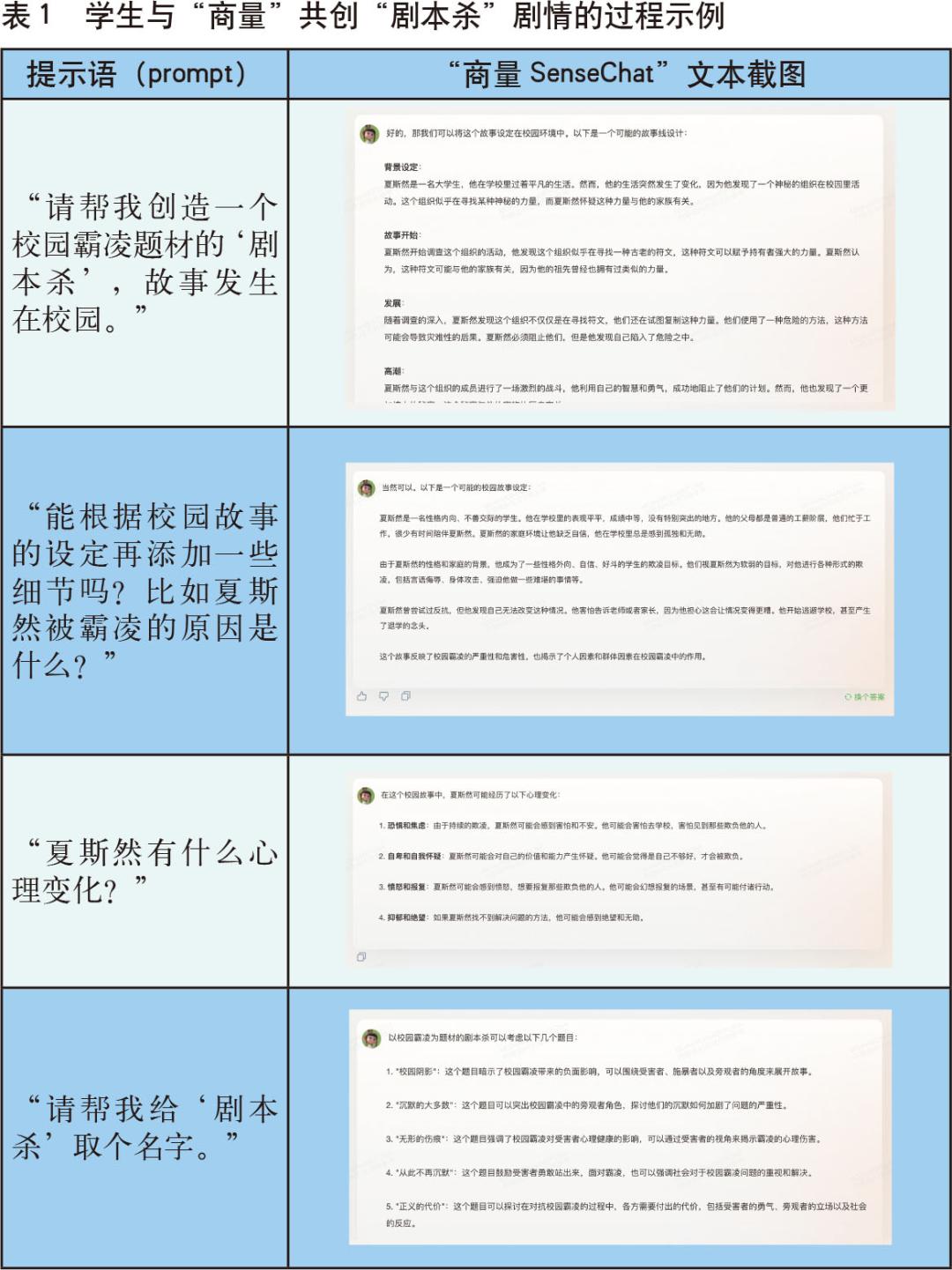 通过任务1—5,学生以3人小组为单位初步确立“剧本杀”的立意与内容,并使用“商量SenseChat”尝试与人工智能共创“剧本杀”大纲,探索与人工智能对话的基础技巧。教师将深化教学内容,帮助学生掌握更为高级的人工智能文本创作技巧。