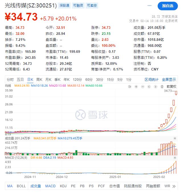 自节后开盘至发稿,光线传媒股价涨幅超过260%,从9.53元/股涨到34.73元/股,创下创历史新高,市值也突破1000亿元。
