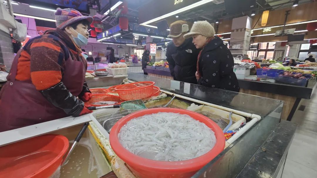 春节前夕,江苏省无锡市滨湖区南泉老街农贸市场内人头攒动,顾客们都在忙着挑选年货。几位本地老人在几家鱼档转来转去,像是在寻找心仪的鱼货。