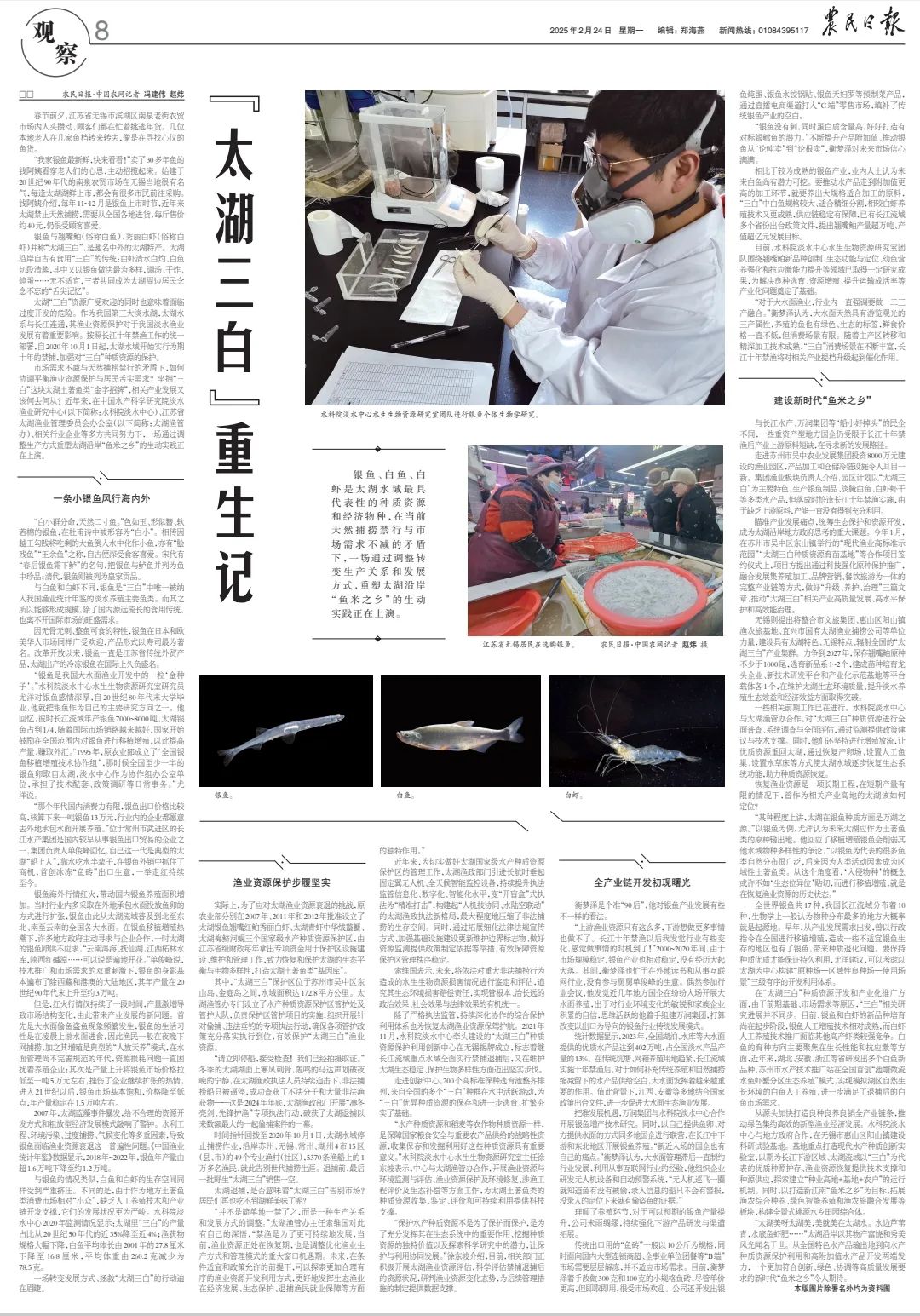 瞄准产业发展痛点,统筹生态保护和资源开发,成为太湖沿岸地方政府思考的重大课题。今年1月,在苏州市吴中区东山镇举行的“现代渔业高标准示范园”“太湖三白种质资源育苗基地”等合作项目签约仪式上,项目方提出通过科技强化原种保护推广,融合发展集养殖加工、品牌营销、餐饮旅游为一体的完整产业链等方式,做好“升级、养护、治理”三篇文章,推动“太湖三白”相关产业高质量发展、高水平保护和高效能治理。