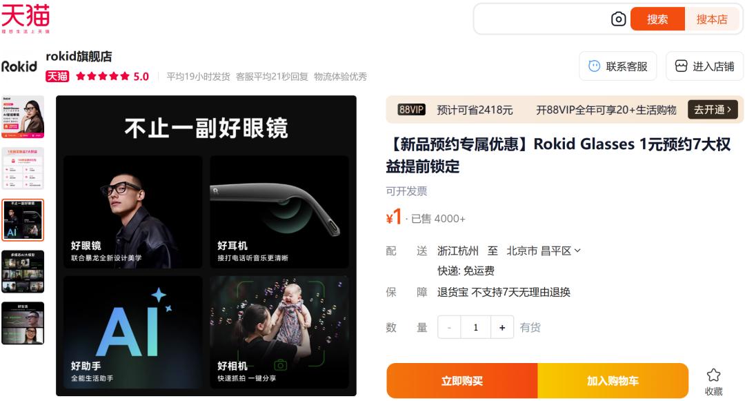 同时,评论区不少网友留言“求Misa同款”Rokid Glasses。截至发稿,该产品在Rokid淘宝天猫官方旗舰店的预购数超4000单,且Rokid Glasses官方海报上的微信社群扫码入群的名额已满。虽然Rokid Glasses还在预售阶段,但Misa已用它完成了一次正式公开场合的脱稿演讲,让消费者看到了AR+AI眼镜的实用场景。