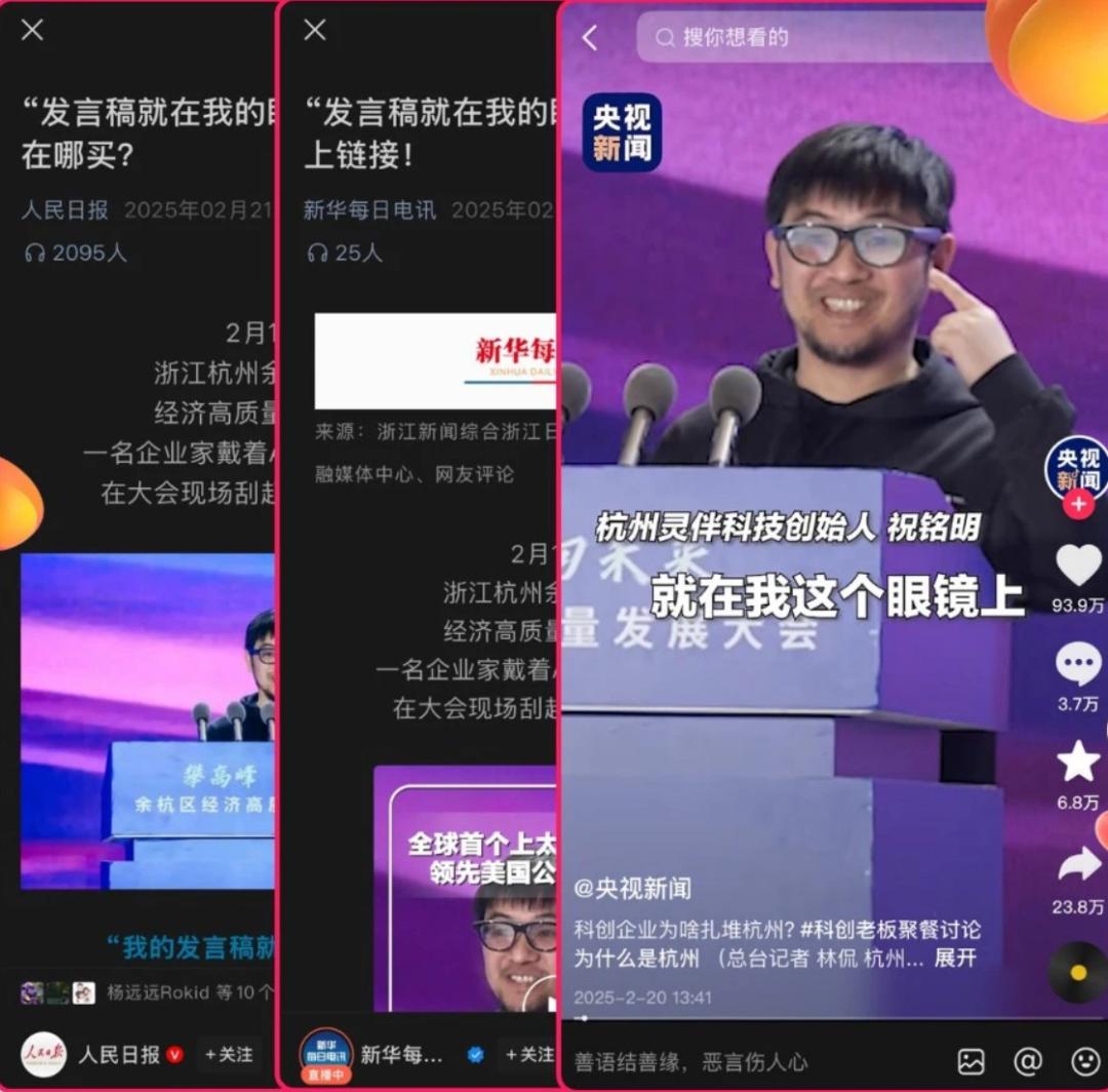 当DeepSeek系列大模型、《黑神话:悟空》、春晚花袄机器人仍被人们在家长里短中津津乐道时,一段戴着AR+AI眼镜脱稿演讲的视频在网络上引发了大量关注,官媒相继转发,累计赞转推破千万。
