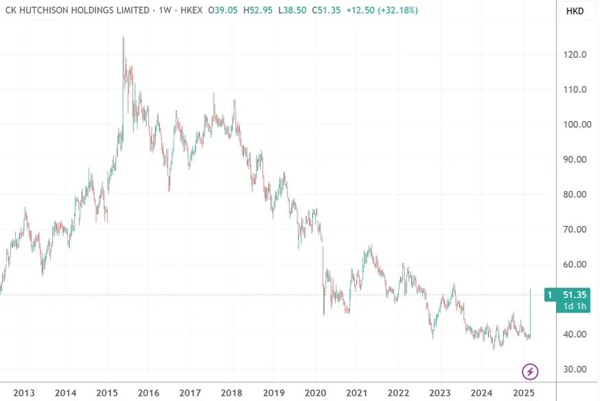 在这笔交易达成前,长和股价正处于连续10年的下降通道中,年线层面连续7年下跌。交易到手的190亿美元,与发布公告前的长和公司市值差不多。
