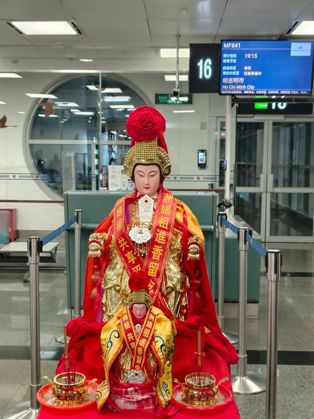 为确保妈祖神像安全、顺畅出行,厦航提前两周召开专项协调会,细致梳理保障流程。同时,积极与团队负责人沟通。3月10日下午,厦门机场国际出发厅值机柜台前,人群簇拥,两尊妈祖神像在护送团队的伴随下入场。神像需人工安检,加上陪护团队人数较多,厦航提前协调好厦门机场海关、厦门高崎边检站、机场安检等单位,为神像及其保障团队设置独立值机柜台和专属候机区域,开辟绿色安检通道,并提供优先登机及全程引导服务,实现了通关“零等待”,确保团队顺利登机。