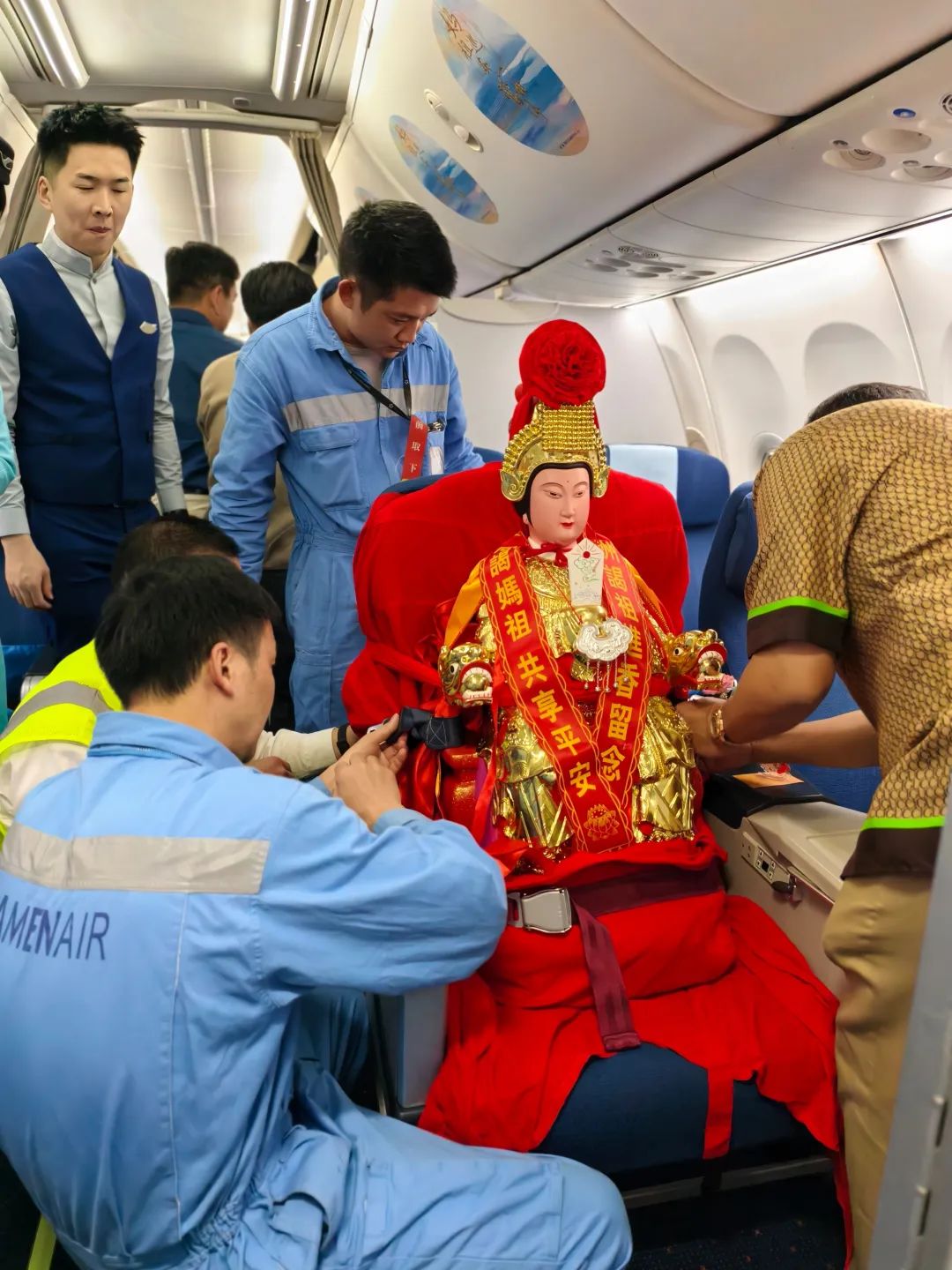 两尊妈祖神像分别被安置在商务舱首排,护驾团队成员则集中在前排就座。为确保飞行安全,厦航特别为神像定制了延长版安全带,并用红绳双重加固,确保神像在飞行全程保持稳定性。随着飞机腾空而起,这场跨越山海的“文化护航行动”正式启航。