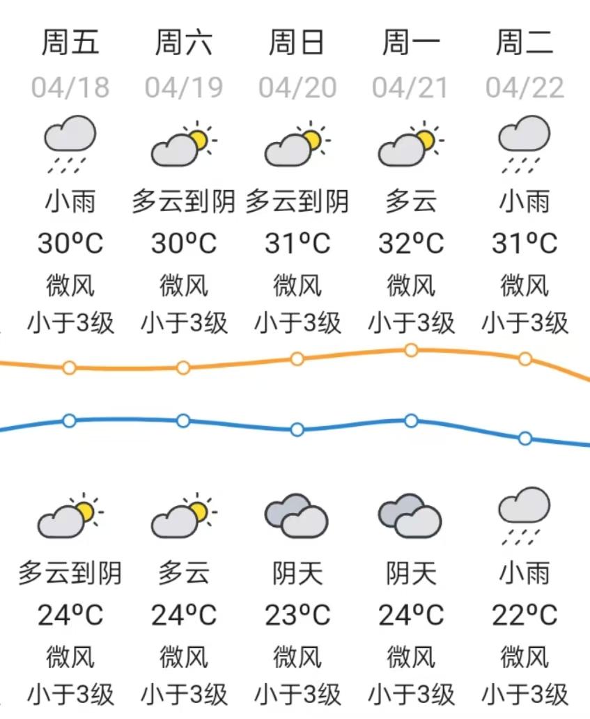 4月18-19日受高空波动和偏南风加大影响,午后有中到强雷雨;4月20-21日雷雨减弱,22-23日受弱冷空气和切变线影响,又有中到强雷雨。