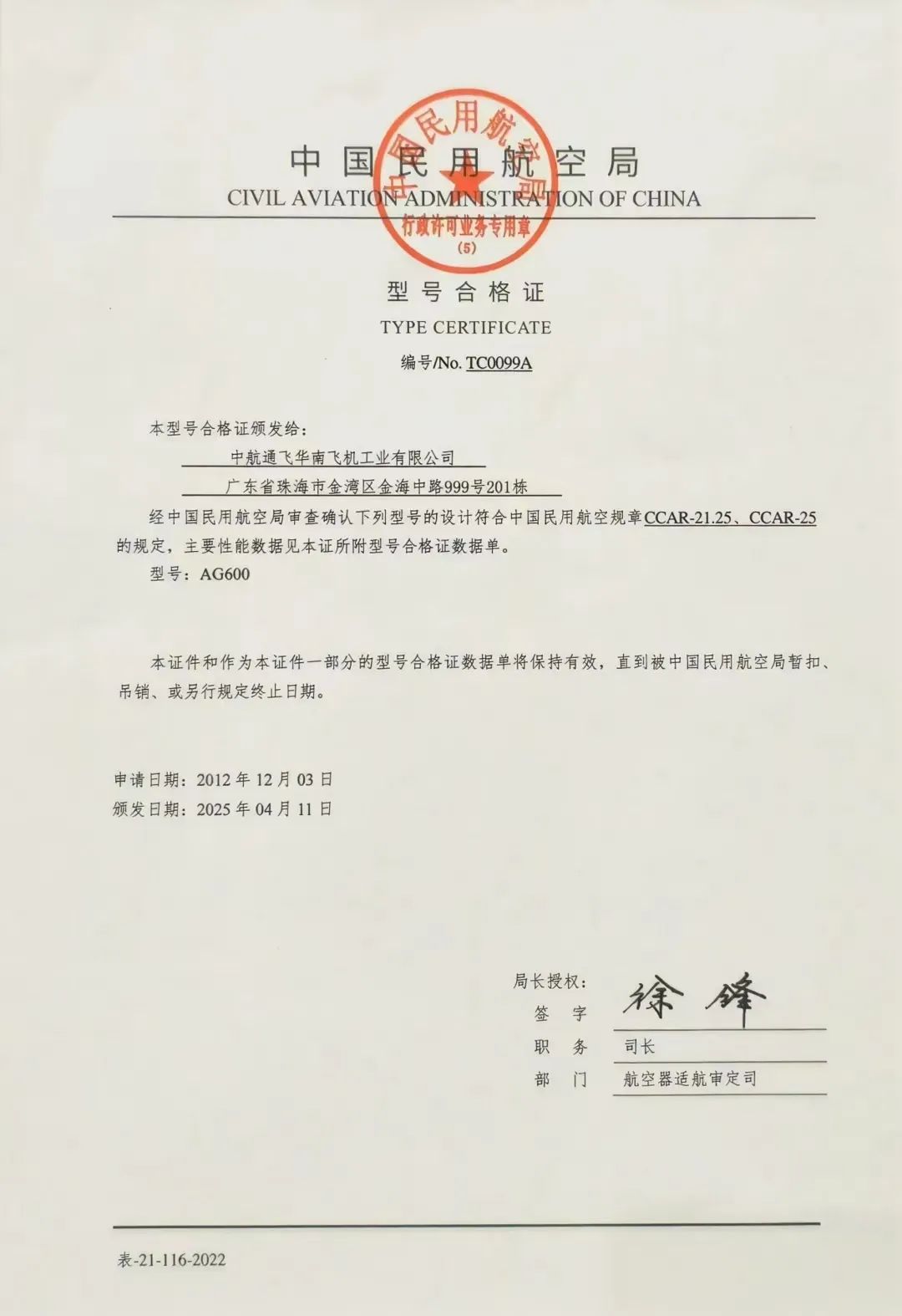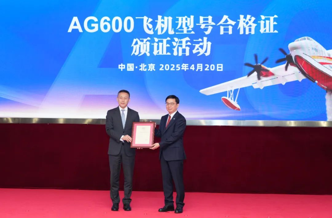 我国自主研制AG600飞机获颁中国民航局型号合格证