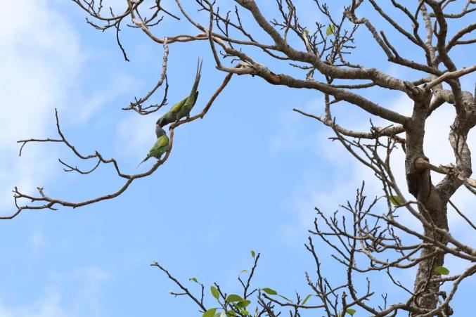 “鹦鹉寨”中最常见的大紫胸鹦鹉。镜头前,布朗族村寨的鲜花与小楼相映成趣,鹦鹉的鸣叫声不绝于耳。村干部介绍,村民世代传承着爱鸟护鸟的传统,榕树和鹦鹉都是“家人”般的存在。这样美好的生态环境吸引了越来越多的观鸟和摄影爱好者,村里的民宿也多了起来。
