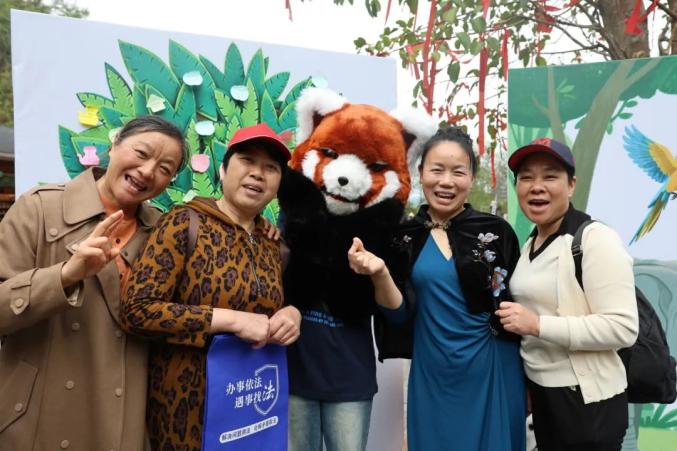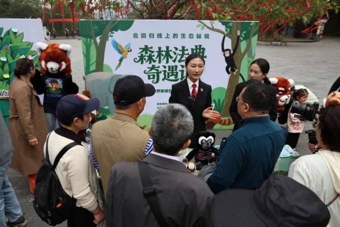 呆萌的小熊猫宝宝。“保护环境,从我做起”“爱护小动物,就是爱护我们自己”“地球日,爱地球”……在公园出口的广场上,法院干警设计的“森林法典奇遇记”活动吸引游客踊跃参与,将承诺便签贴满“法治树洞”展板。