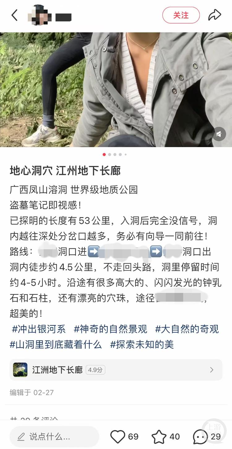该公园曾于去年上榜《中国国家地理》封面。受访者供图记者搜寻网络社交平台发现,不少探险类帖子对该长廊多有提及。有博主撰文表示:“该洞内情况复杂,建议不要贸然入洞,只在洞口拍照留念即可。”也有博主发布了线路攻略,甚至建议“从XX洞口进,XX洞口出”,并特别提及沿途有闪闪发光的钟乳石。