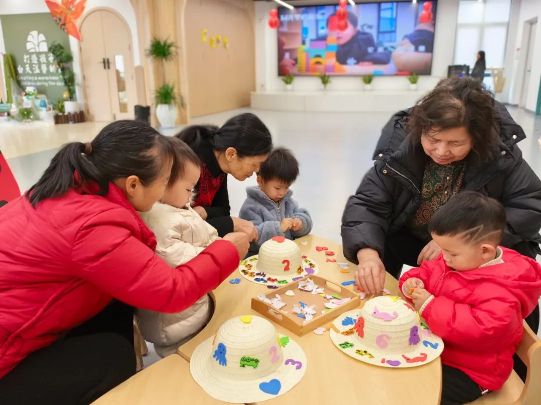 “小朋友们,我来看看谁的草帽最漂亮!”二楼,亲子课堂上,6位幼童与他们的爷爷奶奶正在老师的指导下,用彩色纸片装饰农家常见的草帽;一旁的托育中心教室里,十几个两三岁的孩子做起了健身操,嘴里还奶声奶气地唱着“一步一步,一步一步,跳跳跳……”