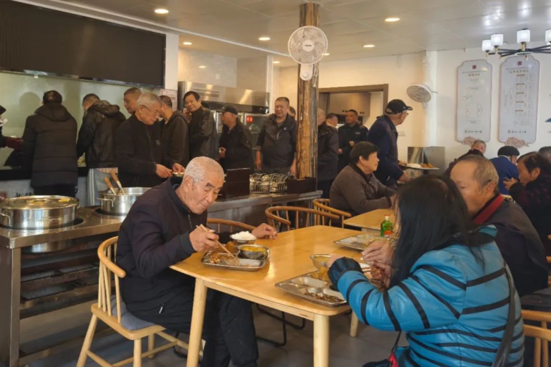 “1个、2个、3个,好了!”一楼室外的小广场上,百岁老人蔡彩英伸出皱纹交织的手,稳稳拿起筷子,将乒乓球夹到纸杯里,全程只花了15秒,引来周围老人一阵喝彩,也为自己赢得了“一包洗衣粉”。此时,楼内“老食好”餐厅饭菜飘香,厨师张华新从中央厨房里端出一大盆红烧鱼。三菜一汤静候村中老人前来用餐。