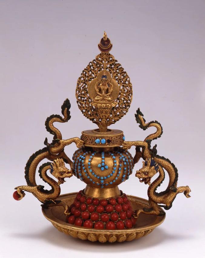 铜鎏金嵌松石珊瑚长寿瓶