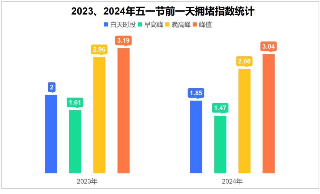 根据互联网地图平台历史数据,2023、2024年五一节前一天,城区白天拥堵指数均值分别为2、1.85,早高峰拥堵指数均值1.61、1.47;晚高峰拥堵指数均值分别为2.96、2.66,峰值分别为3.19、3.04、出现在18:00、18:45,拥堵时长分别为505、480分钟,高峰拥堵集中时间段分别为13:20-21:45、14:45-22:45。
