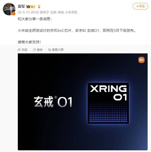 5月15日晚,小米董事长兼CEO雷军在微博上称,小米自主研发设计的手机SoC芯片,名字叫“玄戒O1”,即将在5月下旬发布。
