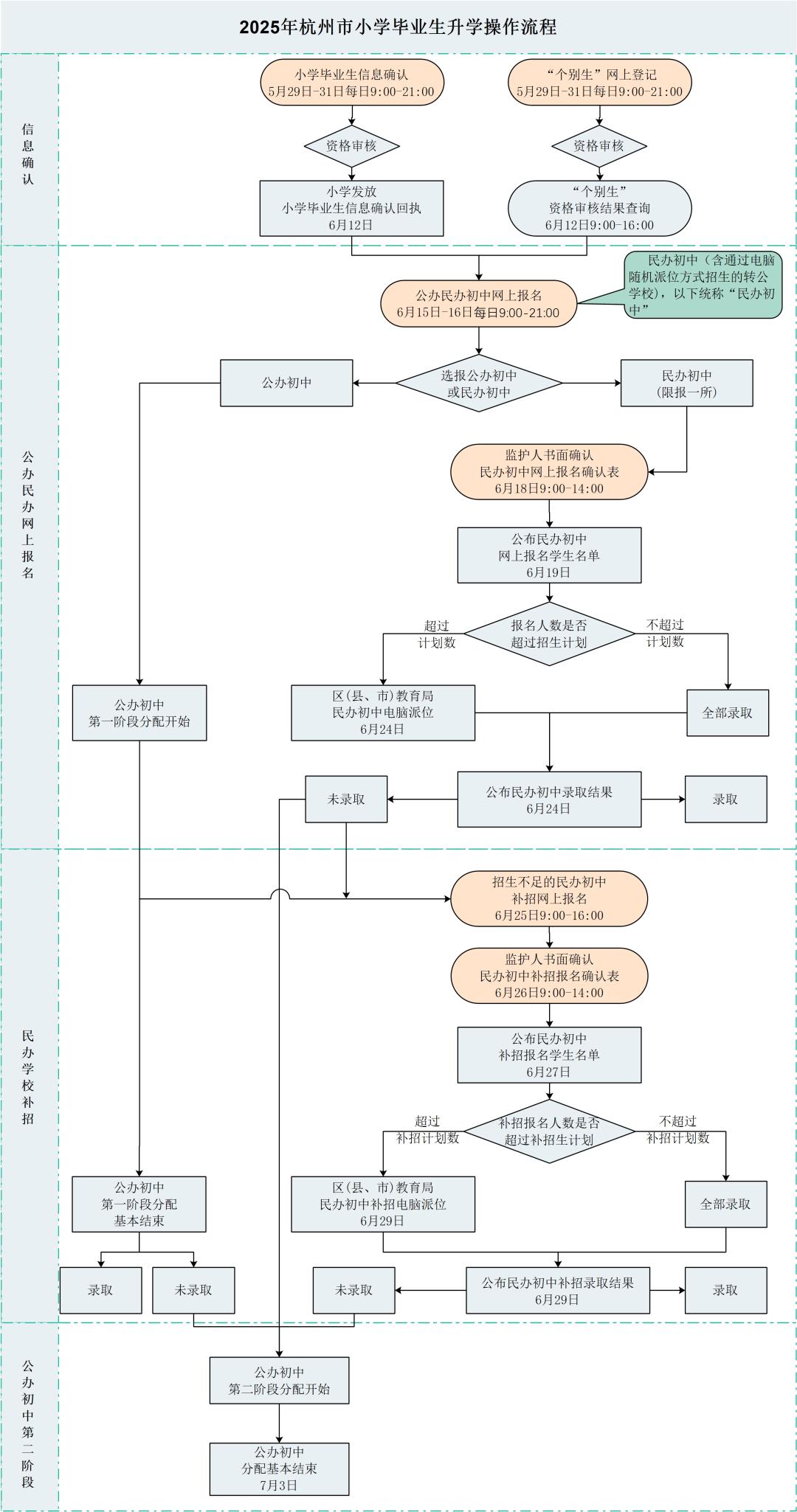 答:经监护人签字确认的民办初中网上报名、补招报名学生名单,由民办初中所在地的区、县(市)教育行政部门公布,家长也可通过【浙里办App—入学早知道—杭州市义务教育阶段学校学生入学】查询,具体时间为: