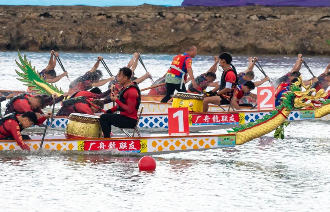 “加油加油!冲啊冲啊!再给点力!”岸边观众热情高涨纷纷为参赛队伍呐喊助威。现场鼓点声和欢呼声汇成一片,响彻整个赛场,将紧张的氛围推向高潮。