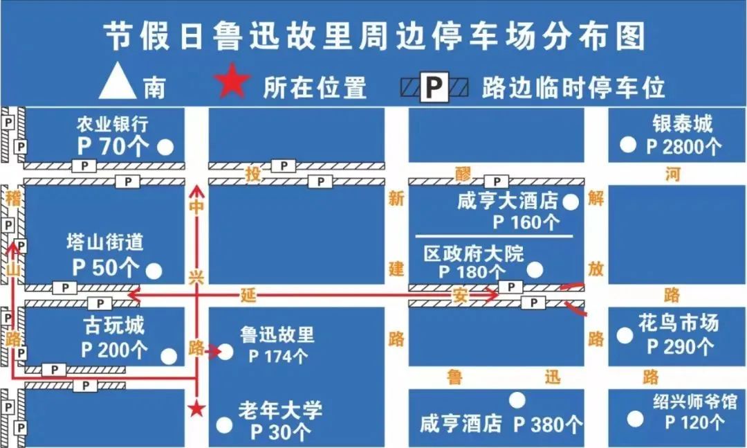 鲁迅故里景区停车位紧张,如景区内的停车场饱和,建议选择外围停车场停车。同时,交警还将根据实际车流量,在景区周边道路临时设置停车指示牌,供车辆临时停放。