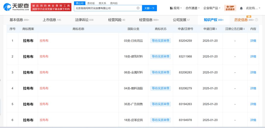 天眼查知识产权信息显示,北京泡泡玛特文化创意有限公司已申请注册80余枚“labubu”“拉布布”相关商标,国际分类为教育娱乐、办公用品、服装鞋帽等,当前部分商标已注册成功。