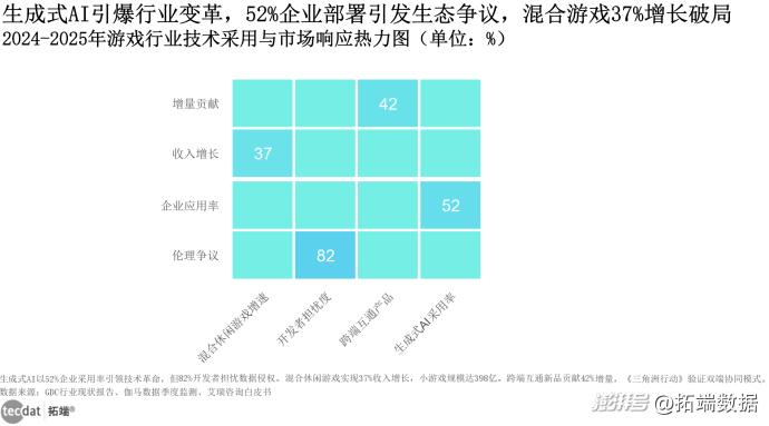 2024年全球游戏市场规模突破1877亿美元,中国以37.5%的全球占比成为核心增长引擎。生成式AI以52%的企业采用率重塑开发流程,混合休闲游戏实现37%的收入增长,跨端互通产品贡献42%增量。玩家行为呈现深度参与特征,策略类游戏以175亿美元登顶最赚钱品类,移动端贡献55%行业收入。