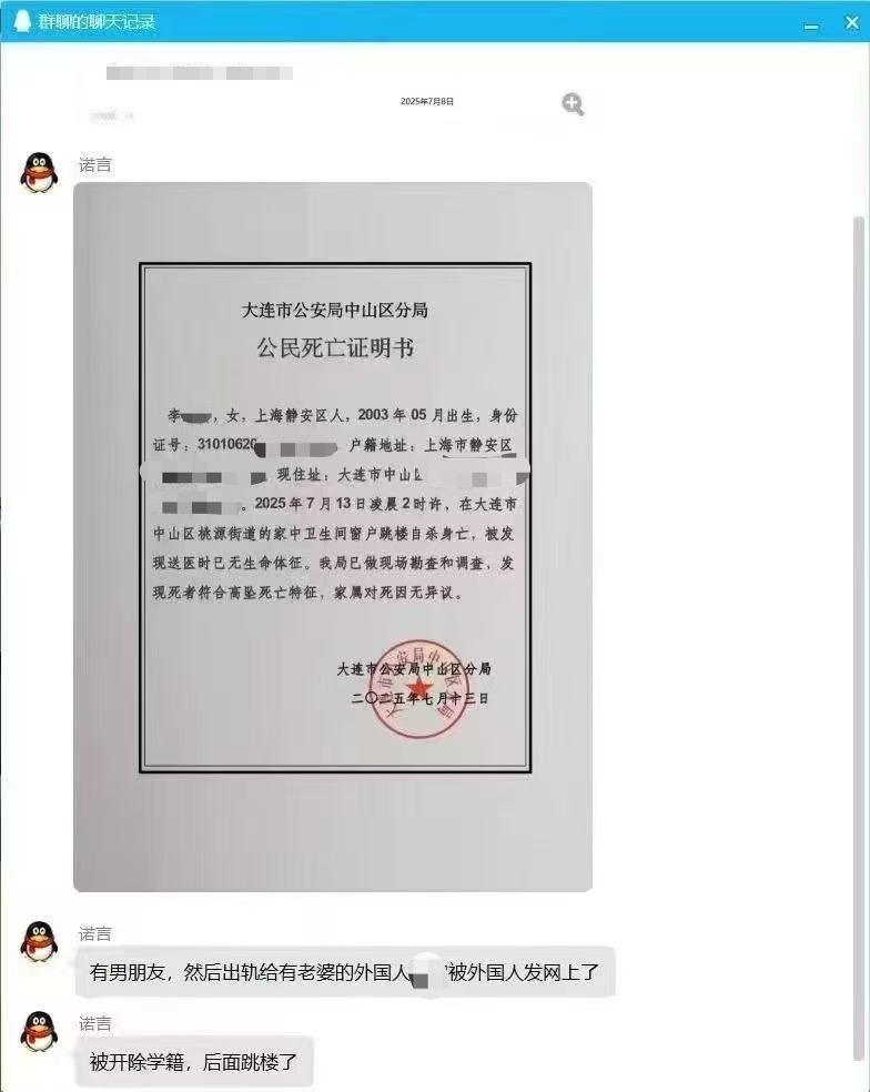 7月14日,一则《大连市公安局中山区分局公民死亡证明书》在网络流传,其中称出生于2003年李某某于7月13日凌晨2时许跳楼自杀身亡。该文书中提及的李某某与近期大连工业大学隐私视频泄露当事学生李某某同名,引发网友关切。