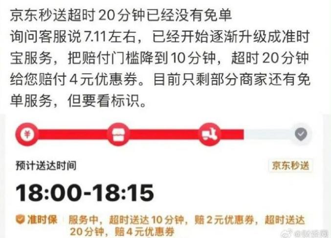 7月16日有媒体报道称,社交媒体上,不少用户发文称,京东外卖取消了曾被视为护城河的“超时20分钟免单”服务,改为了“超时20分钟赔付4元优惠券”。
